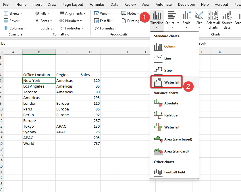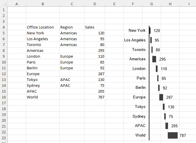 Voilà! Your new vertical waterfall chart instantly appears on your worksheet. You’ve just turned a table into a visual in a fraction of the time it normally takes to create such chart in Excel.