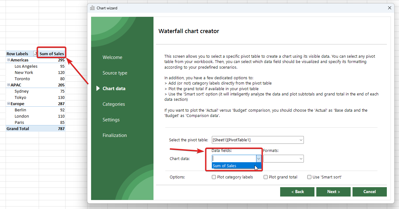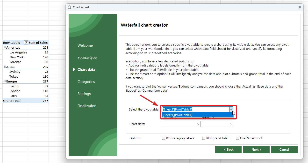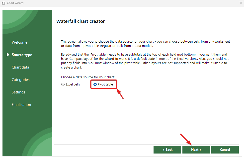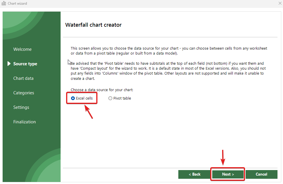 On this screen you can choose if you want to create your chart using Excel cells (pointing directly to specific ranges) or by using an existing pivot table. We will present two ways in the following sub sections.