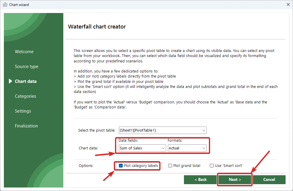 We will choose “Actual” for now and “Plot category labels“, and click “Next“: