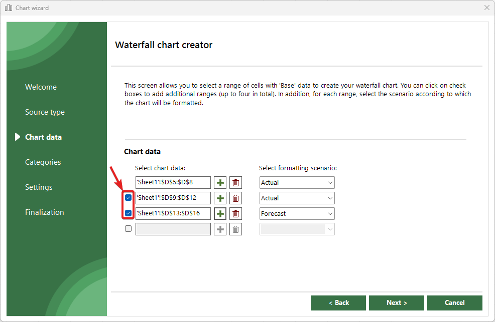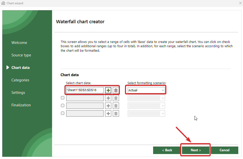 In addition, if you select multiple ranges then you can use them to plot multiple scenarios on the same chart right away, like Actuals and Forecast. But, for our current case, we will choose “Actual” and click “Next“