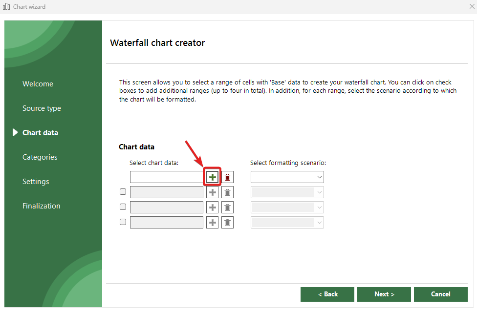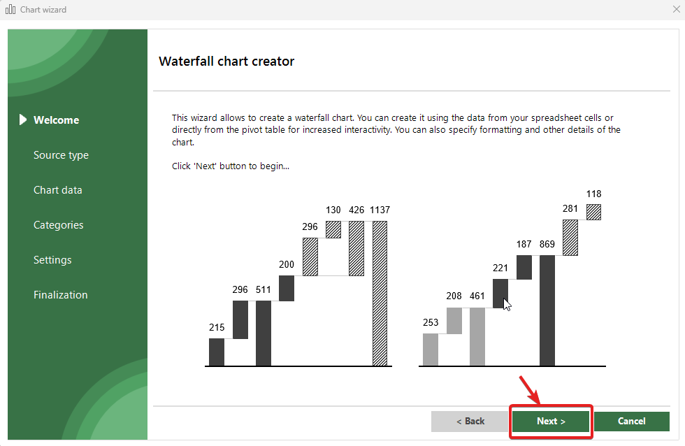 Now, let’s use the XLBuddy to create our vertical waterfall chart. It will guide you step by step.