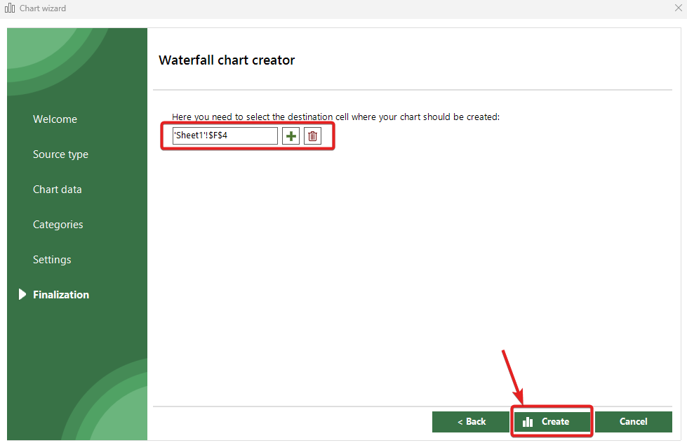 On the final screen, we need to select a destination cell, where we would like to create our chart. When ready, click “Create” button to create your waterfall chart:
