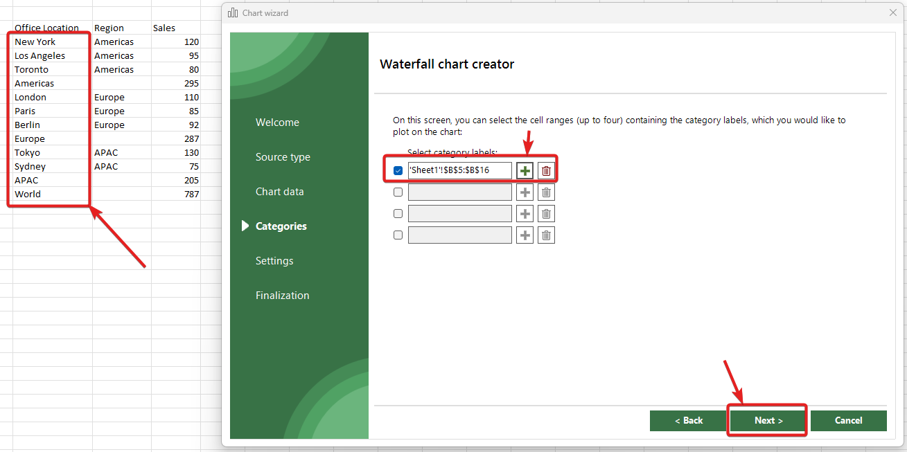 The next screen allows to select data range with our category labels. In our case, this will be our Office Locations. As previously with our numerical data, please click on the green “+“, select the correct range and click “Next“: