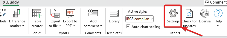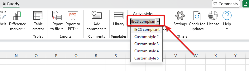 Your settings are organized into Styles. Think of a style as a container holding the settings for your visual elements (charts, tables, comments, highlight etc.). XLBuddy has five Styles built-in, which you can customize to your liking and switch between them easily.