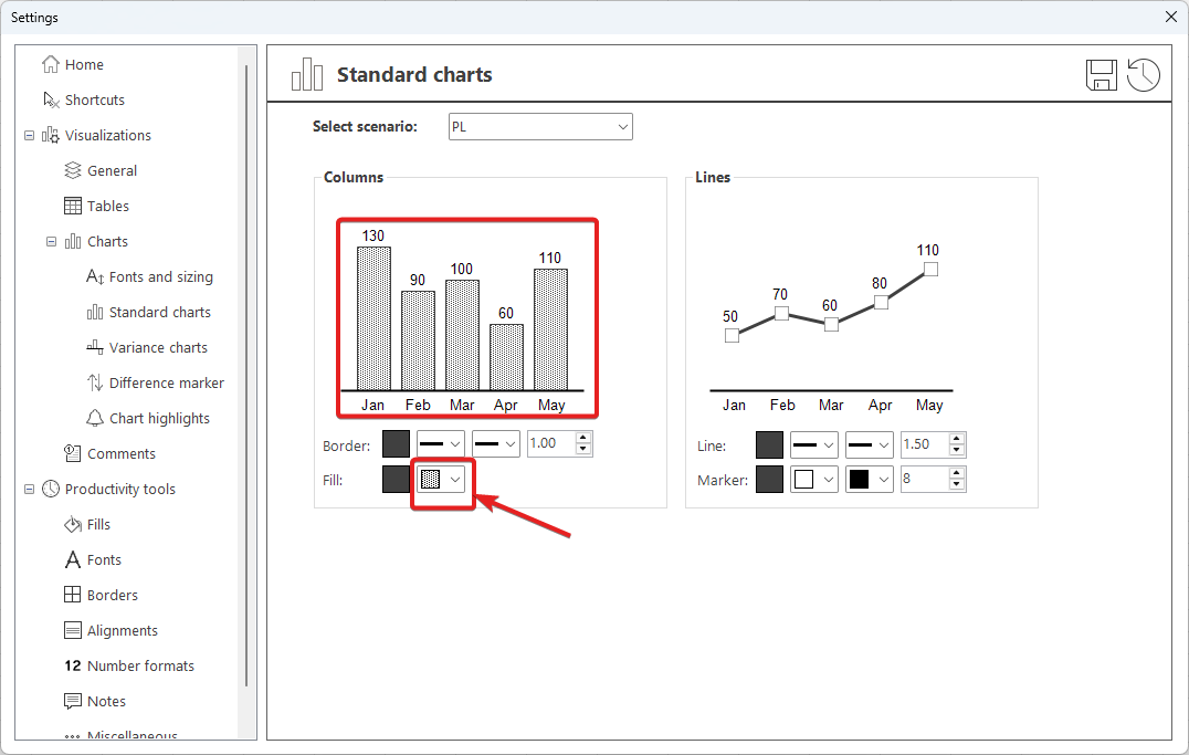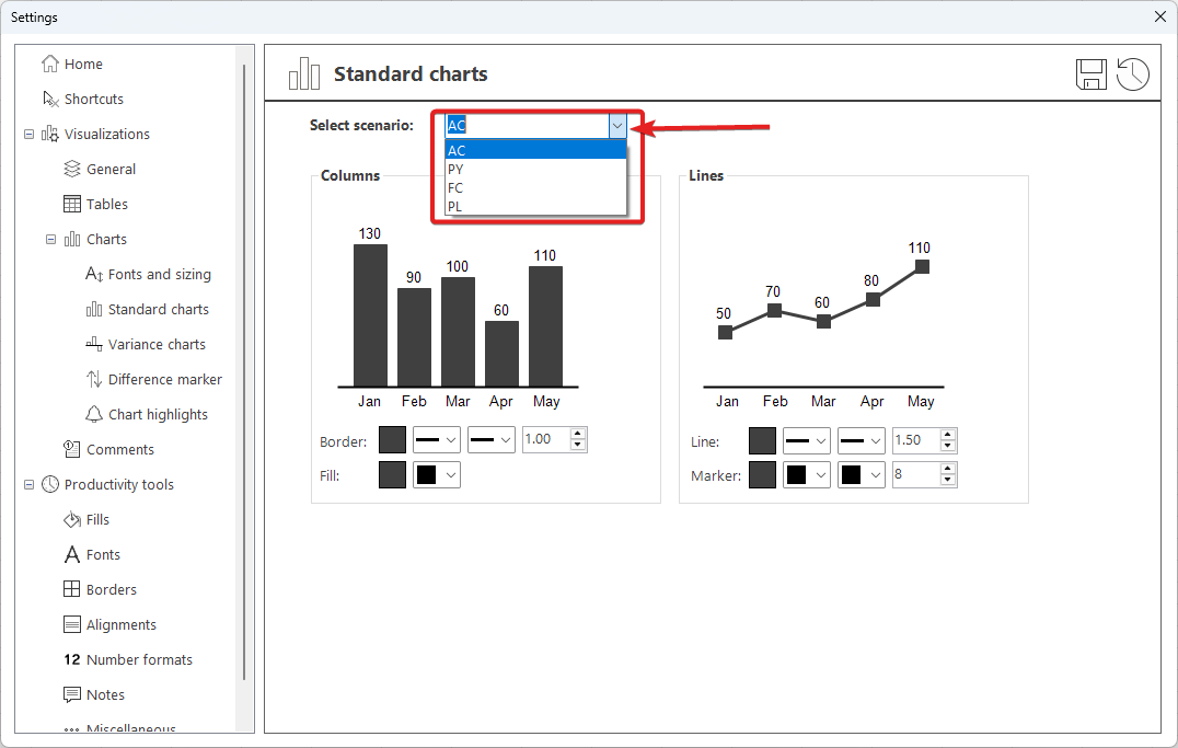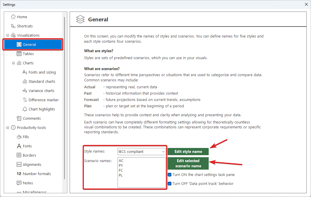 In addition, each Style consists of four predefined, functional Scenarios. They are used in the chart wizards, formatting task panes and other places. We designed it this way, so you can easily change formatting of certain elements or visuals according to your needs – all without the requirement to memorize all settings and apply them one by one manually. It is a huge time saver.