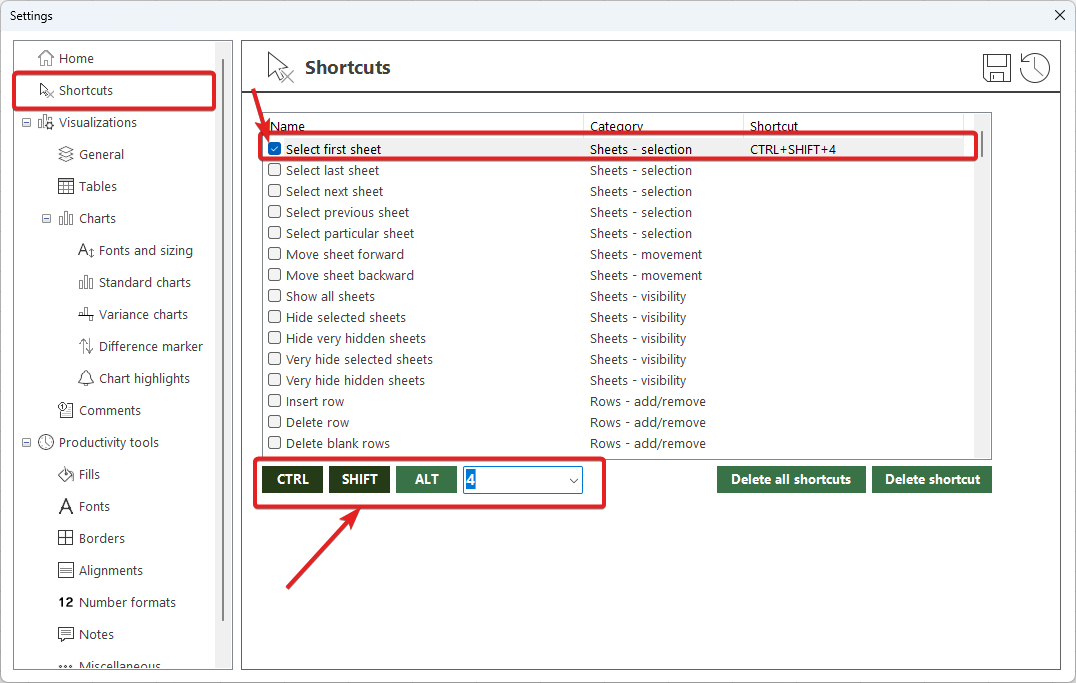 This section allows you to enable and set custom keyboard shortcuts for almost all available XLBuddy’s features: