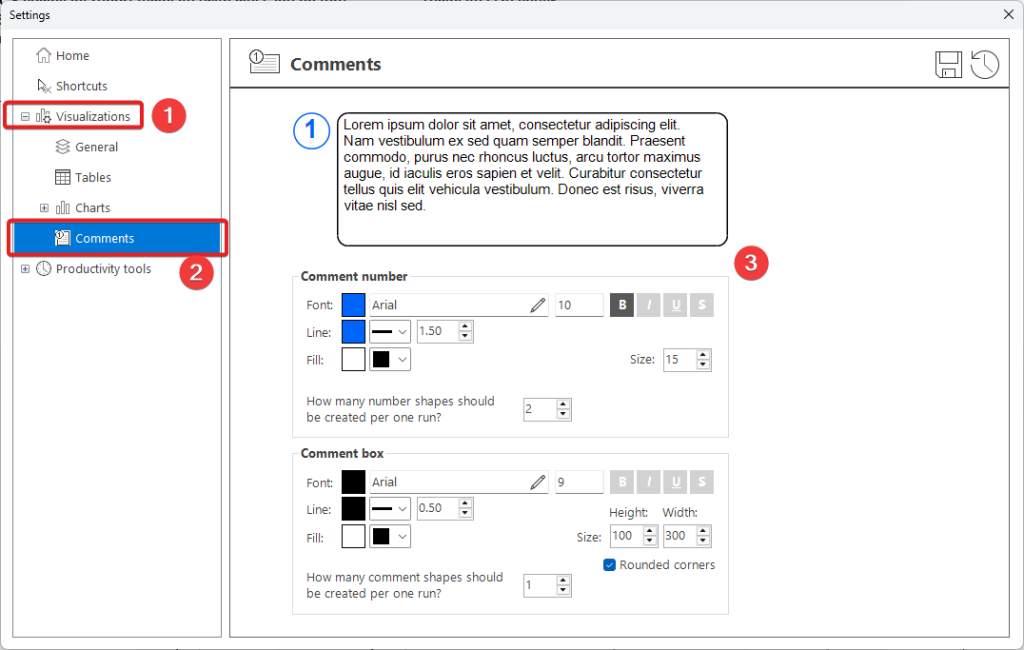 You can define how many comment boxes and numbers should be created per each ‘whole comment’. By default it is one box and two numbers (one to be placed near your comment box, one to be placed next to the data point).