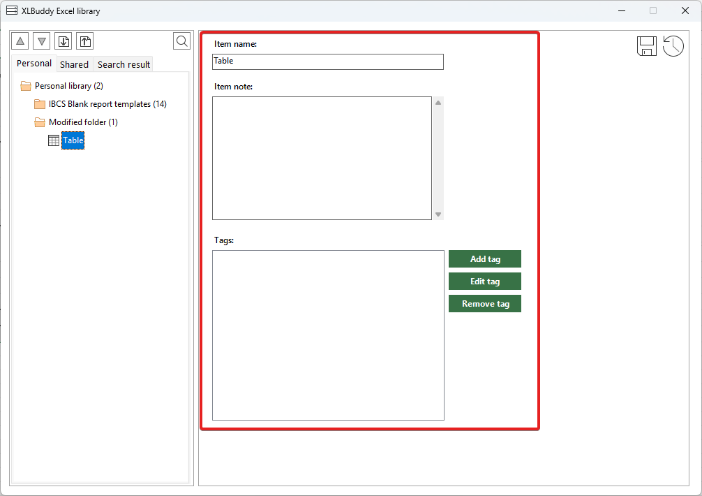 On this screen you can edit the item name, add a note and also add tags. Tags can be helpful for your search, for example, you can store multiple different table designs and add specific tags to them. This will help you when you want to find ‘that one particular table’ and the names are not explanatory enough.