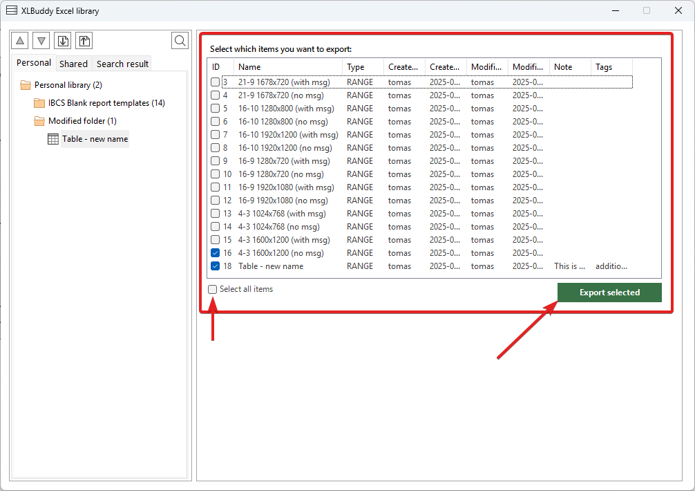 Then, you will be presented with the list of all library items. You need to select, which items you want to export (or click ‘Select all items’ if you want to export the whole library). Once you select the items, click ‘Export selected’ button: