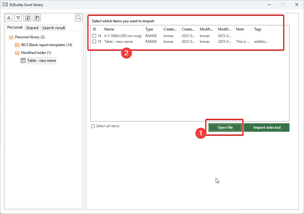 You will be presented with the dedicated import screen. You have to select a specific file that you want to import and once selected, you will be presented with the list of items that you can import: