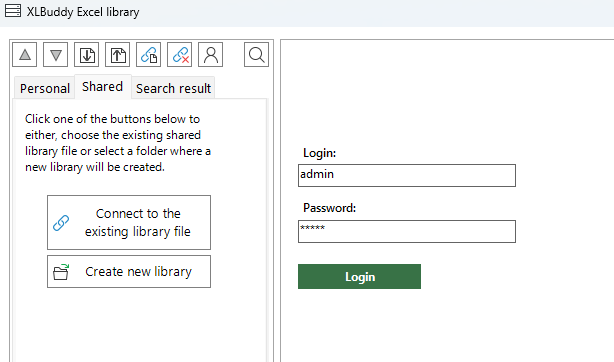 To connect to the existing library, you need to select the library file and then type the login credentials provided to you by the library administrator.