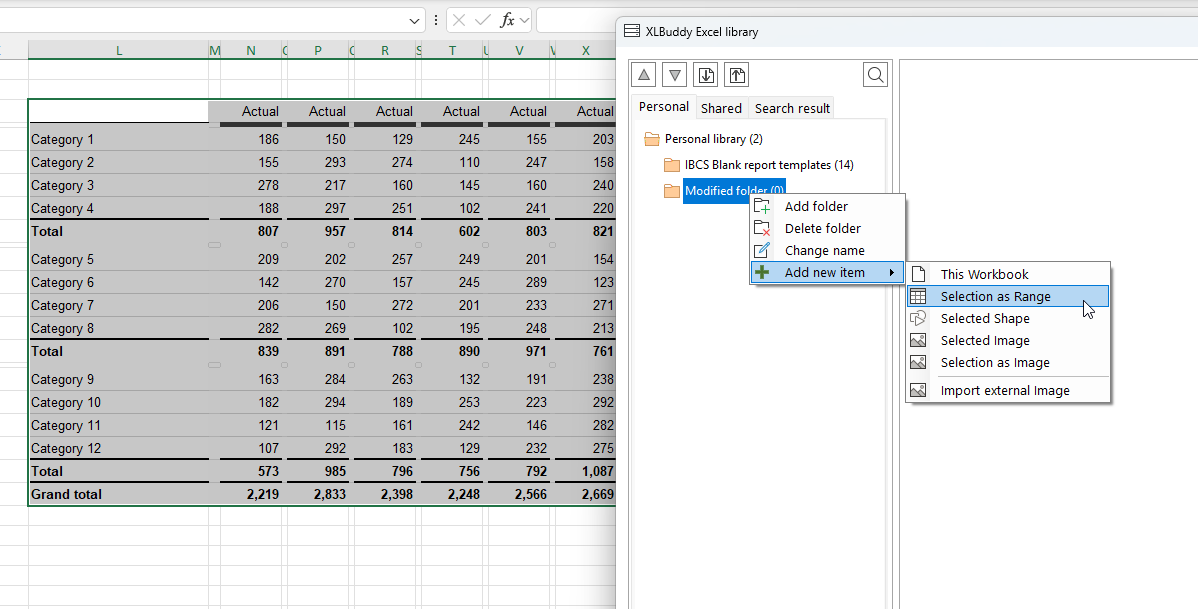 To add a new item to the library, right click on the folder that will hold the newly added element and click ‘Add new item’. Then you will need to choose what you want to add, depending on your need and selection. When a shape is selected, you cannot add range, so you need to make sure that you selected a correct item and then click the correct button.